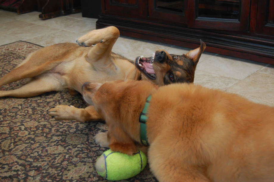 She loved to play tug-of-war. She and Bear (another large rescue) got so rambunctious at times that the furniture was rearranged. When Bear died, we brought home Buster, who was only four months old. She adopted him immediately and dragged him across the floor by the chew toy until he grew enough to hold his own in the tug-of-war arena. More furniture was rearranged.